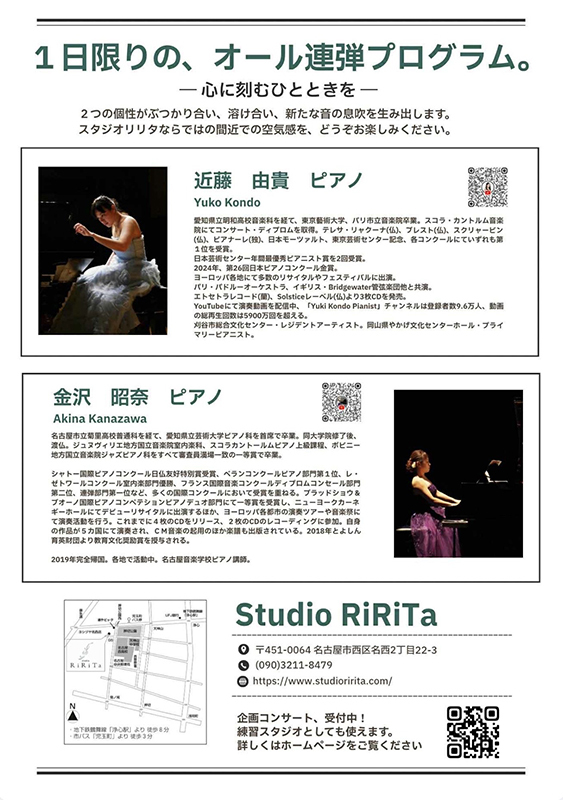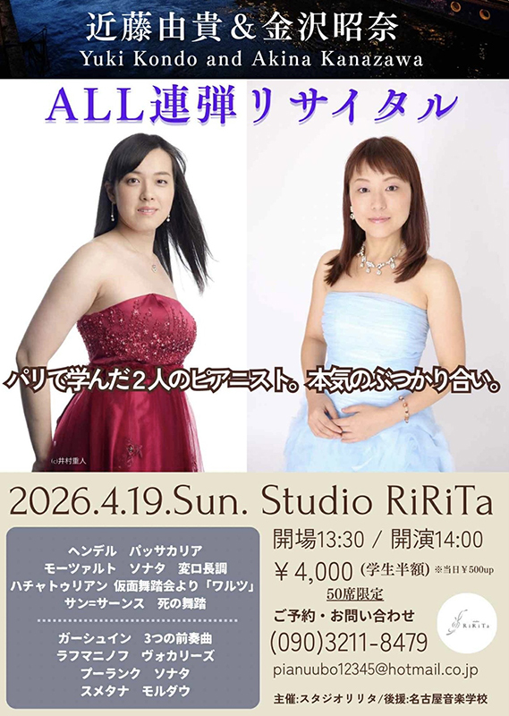 近藤由貴&金沢昭奈 ALL連弾リサイタル2026年4月19日(日) 開演14:00 近藤由貴ピアノリサイタル