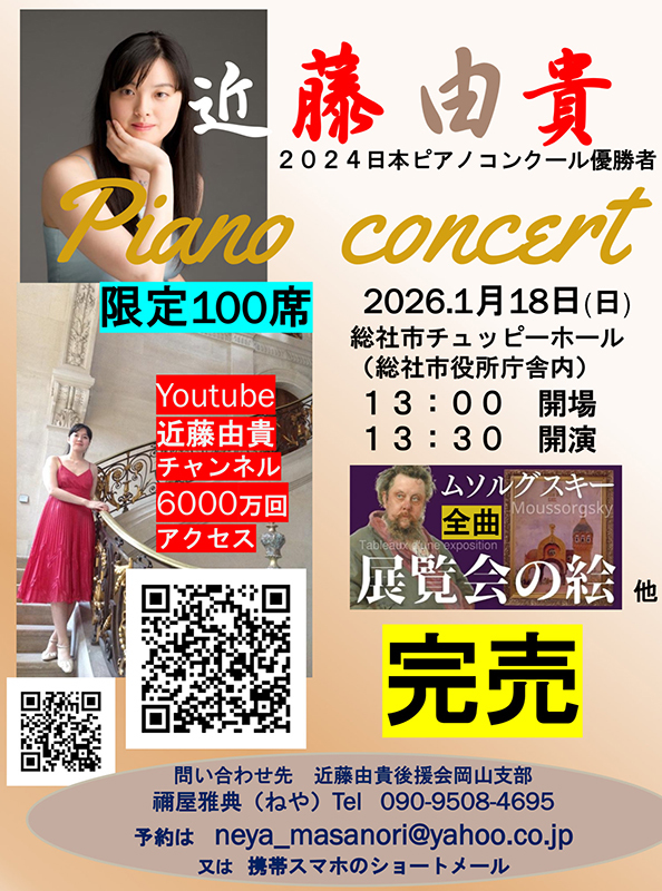 Concert in OkayamaDecember 3, 2023 (Sun.) Start time at 13:30 Yuki Kondo Piano Recital